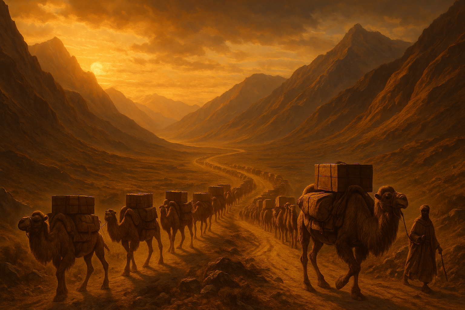 Караваны верблюдов через пустыню Гоби и бескрайние степи.